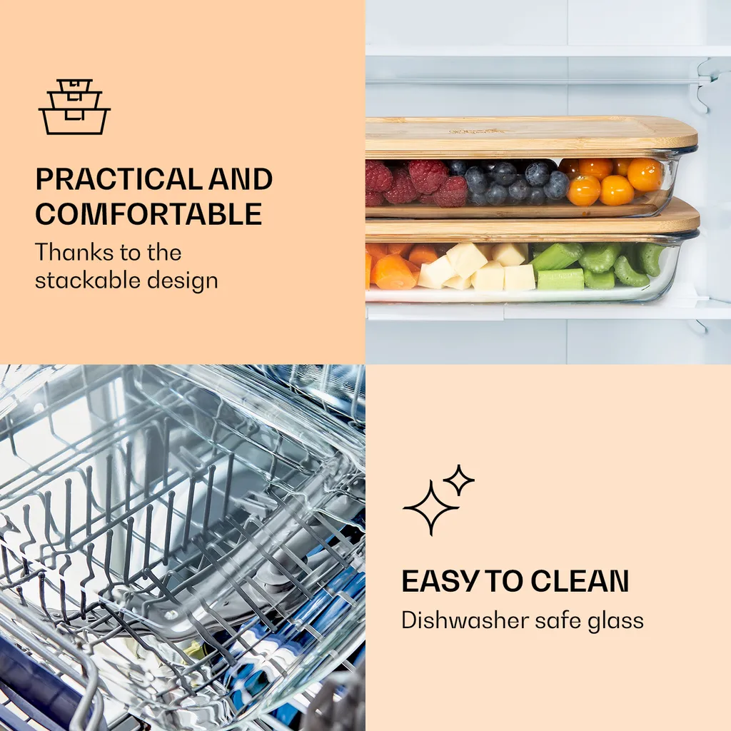 Klarstein Bambuswald Aufschnittbox Mit Deckel , 1 Liter , 2er Set , Glas & Bambus , Hitzebeständig , Spülmaschinenfest , Stapelbar