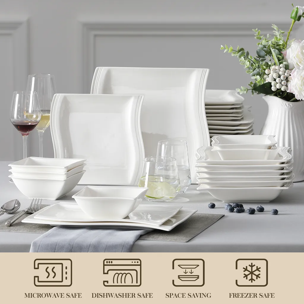 MALACASA, Serie Flora, 26 Tlg. Cremeweiß Porzellan Geschirrset Kombiservice Tafelservice Mit 6 Schalen, 6 Dessertteller, 6 Suppenteller, 6 Speiseteller Und 2 Rechteckigen Platten