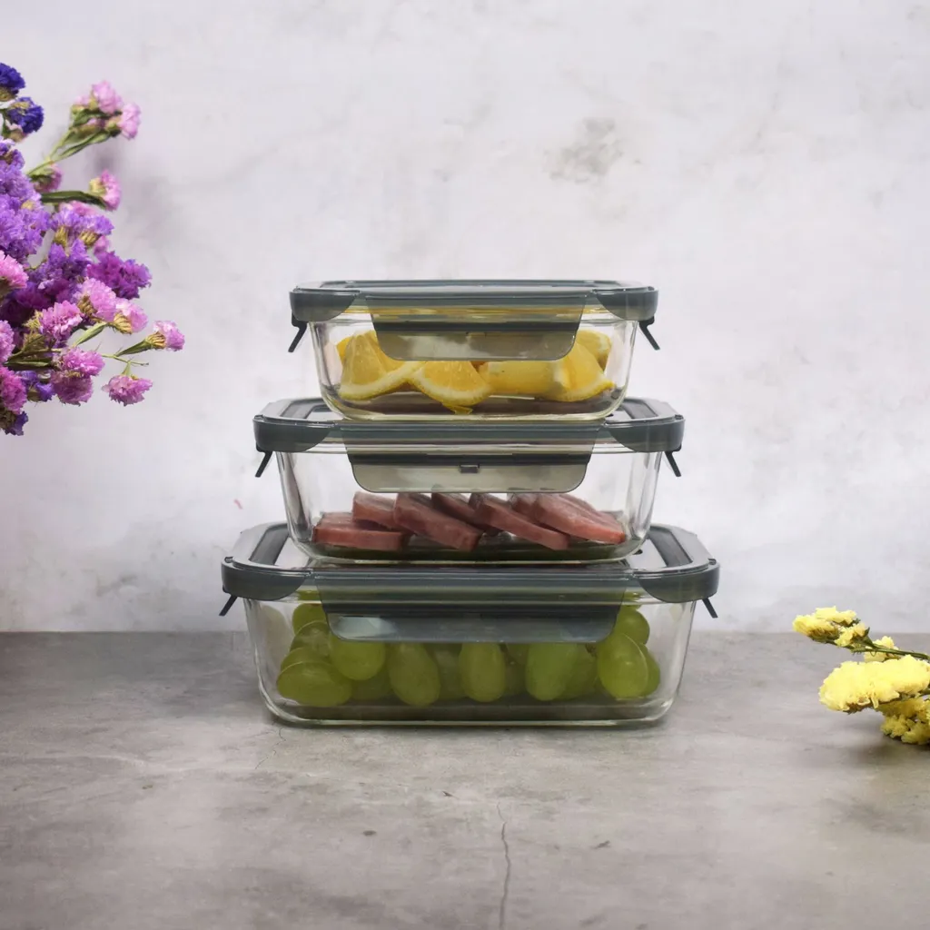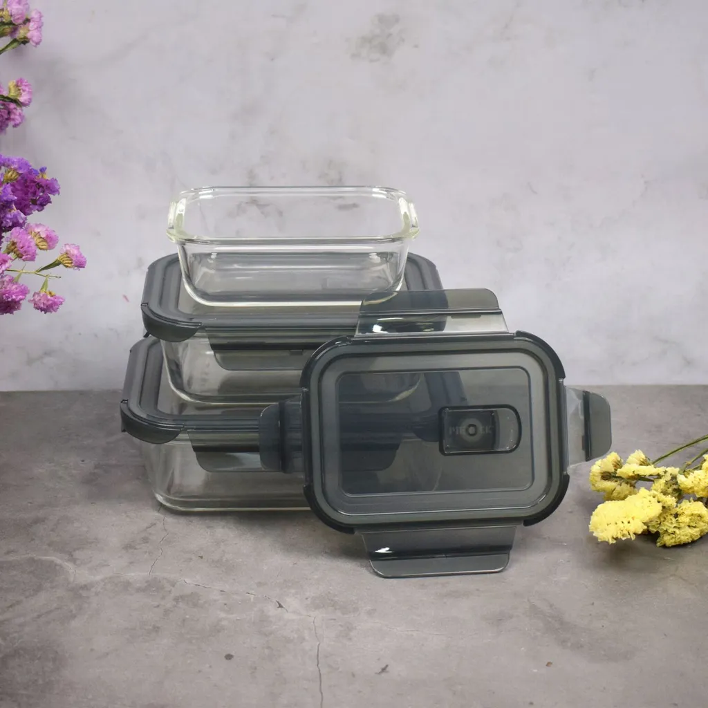 PIE LOCK Vorratsdosen 6 Teilig Eckig – Vorratsdosen Set Mikrowellengeeignete Essensbox Vorratsbehälter – Grau Glasdose Lunchbox Vorratsgläser Set