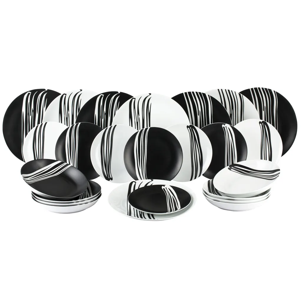 Waterside 0000006105 Tafelservice Milan Für 8 Personen + Streifen, Porzellan, Rund, Schwarz/weiß (1 Set, 24-teilig)